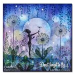 A single silhouette stamp of the fairy, Olivia, holding a dandelion seed up in the air.